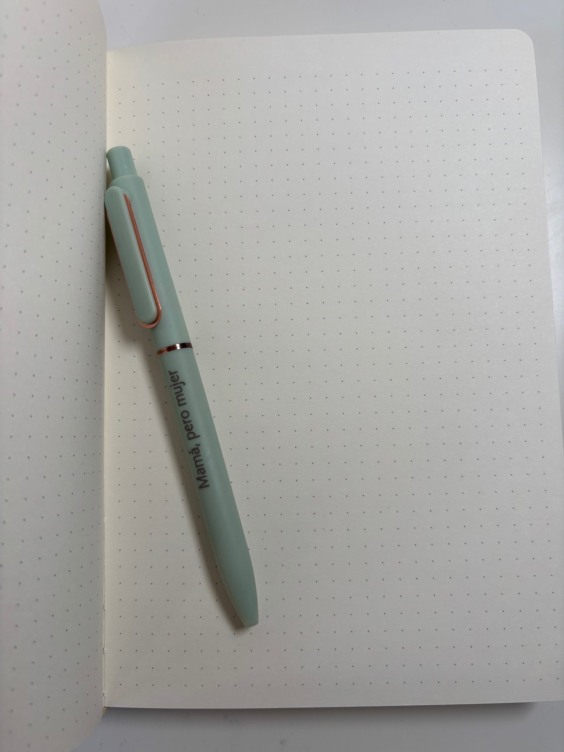 Bolígrafo soft gel, con tacto suave, detalles en dorado, verde agua pastel.